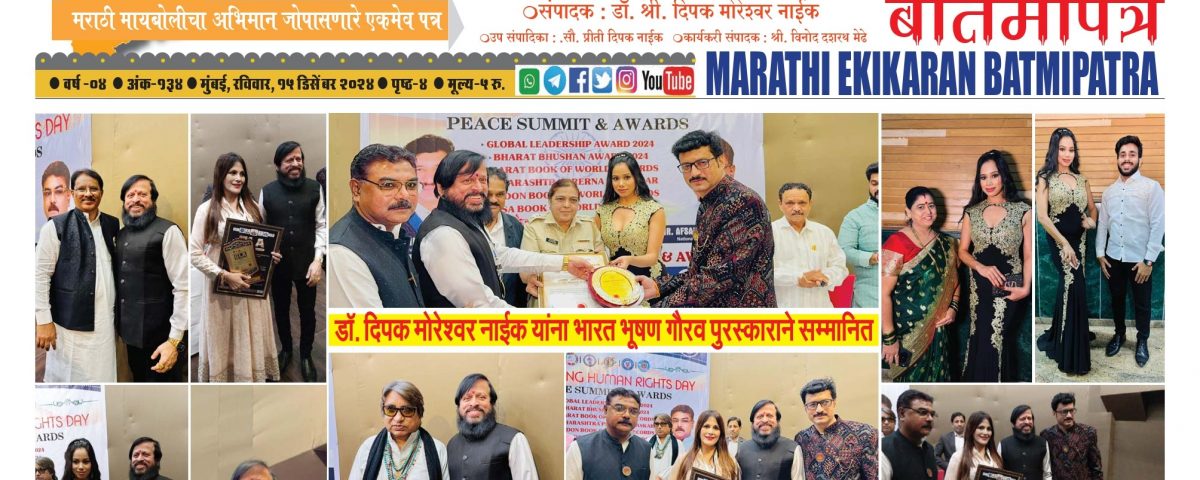 आश्रय सामाजिक सांस्कृतिक शैक्षणिक ट्रस्टचे संस्थापक आणि पोलीस बातमी पत्रचे संपादक डॉ दिपक मोरेश्वर नाईक यांना इंटरनॅशनल ह्यूमन राईटस् च्या वतीने भारत भूषण गौरव पुरस्कार प्रदान करण्यात आला. त्यांच्या सामाजिक सांस्कृतिक शैक्षणिक आणि पत्रकारितेतील उल्लेखनीय योगदानाबद्दल त्यांचा सन्मान अंधेरी येथील मेयर हॉल येथे दि. १३.१२.२०२४ रोजी करण्यांत आला.
