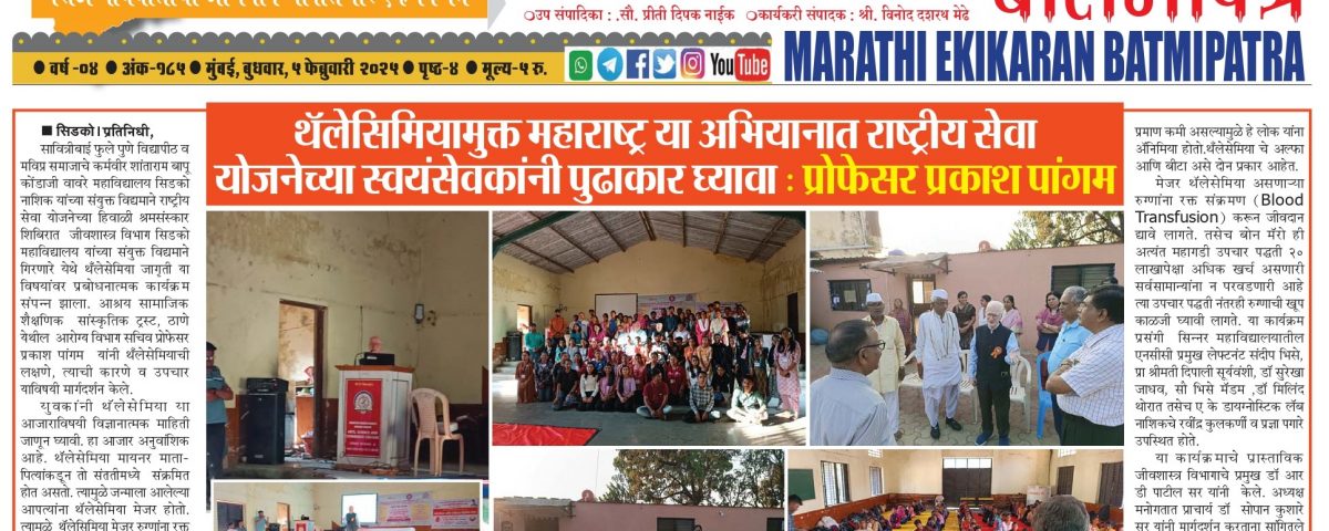 थँलेसेमिया जागृती या विषयांवर प्रबोधनात्मक कार्यक्रम सावित्रीबाई फुले पुणे विद्यापीठ व मविप्र समाजाचे कर्मवीर शांताराम बापू कोंडाजी वावरे महाविद्यालय सिडको नाशिक यांच्या संयुक्त विद्यमाने राष्ट्रीय सेवा योजनेच्या हिवाळी श्रमसंस्कार शिबिरात जीवशास्त्र विभाग सिडको महाविद्यालय यांच्या संयुक्त विद्यमाने गिरणारे येथे संपन्न झाला.(दिनांक:४.२.२०२५)