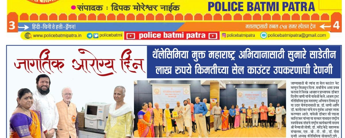 पुणे – थॅलेसिमिया मुक्त महाराष्ट्र अभियान संपूर्ण राज्यभर प्रभावीपणे राबवणाऱ्या आश्रय सामाजिक सांस्कृतिक शैक्षणिक ट्रस्ट या सेवाभावी संस्थेला जागतिक आरोग्य दिनाचे औचित्य साधून एक महत्त्वपूर्ण उपकरण – सेल काउंटर – भेट स्वरूपात प्रदान करण्यात आले आहे. या उपकरणाची अंदाजे किंमत रु. ३.५ लाख असून, हे उपकरण थॅलेसिमिया निदानासाठी अत्यंत उपयुक्त ठरणार आहे.ही देणगी मिळवुन देण्यात राष्ट्रीय अध्यक्ष जनकल्याण रक्तपेढी परिवार समिती भारत अध्यक्ष पॅथॉलॉजिस्ट प्रा. डॉ. दिलीप बाळकृष्ण वाणी (एम.डी.) यांची प्रमुख भूमिका राहिली आहे. त्यांच्या प्रयत्नांनी आणि डी. जे. वैद्यकीय महाविद्यालय, पुणे येथील पॅथॉलॉजिस्ट डॉ. पद्मजा कानिटकर यांच्या अमूल्य सहकार्यामुळे ही वस्तुनिष्ठ आणि अत्यावश्यक मदत ट्रस्टला प्राप्त झाली.