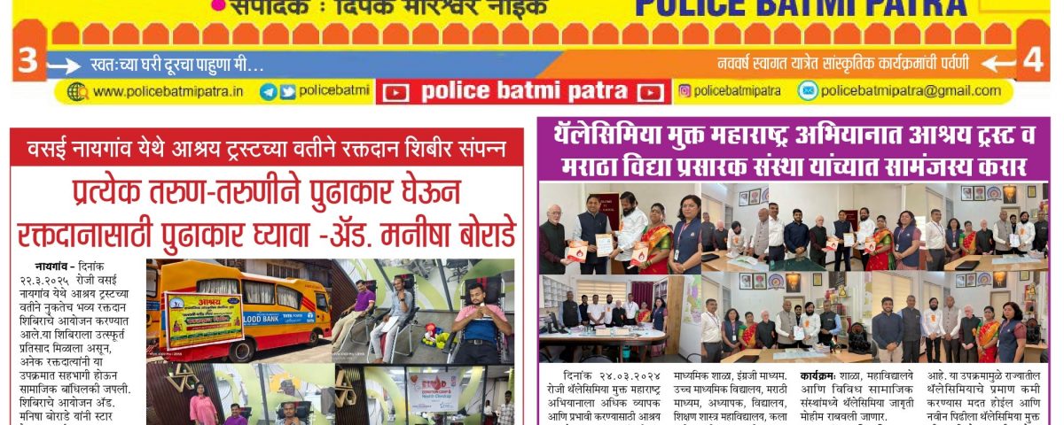 नायगांव – दिनांक २२.३.२०२५ रोजी वसई नायगांव येथे आश्रय ट्रस्टच्या वतीने नुकतेच भव्य रक्तदान शिबिराचे आयोजन करण्यात आले.या शिबिराला उत्स्फूर्त प्रतिसाद मिळाला असून, अनेक रक्तदात्यांनी या उपक्रमात सहभागी होऊन सामाजिक बांधिलकी जपली.