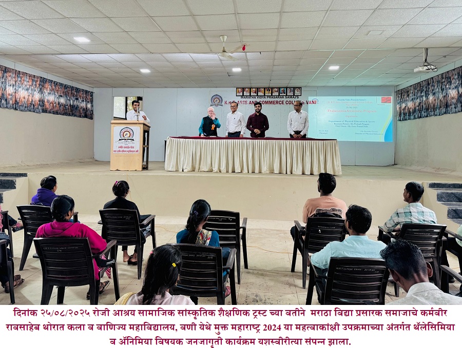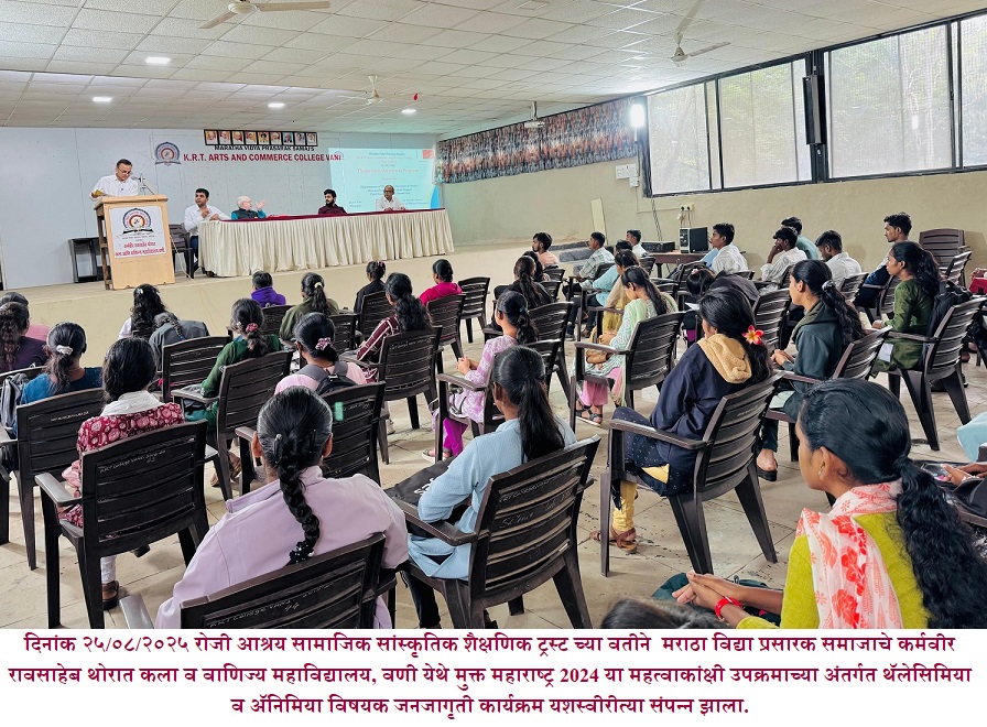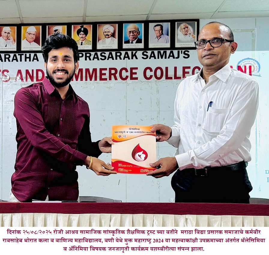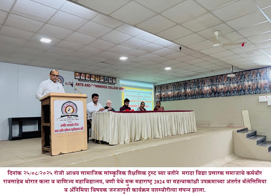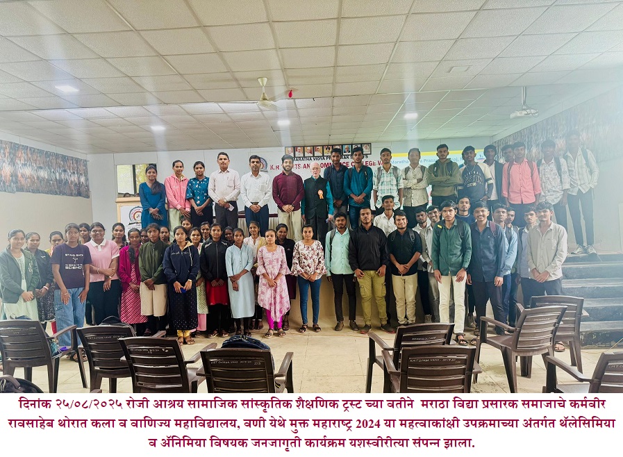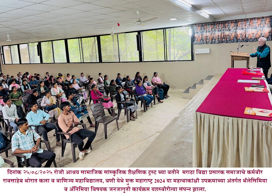 दिनांक ६ ऑगस्ट २०२५ रोजी थॅलेसेमिया जनजागृती कार्यक्रम वडनेर भैरव महाविद्यालयात संपन्न आश्रय ट्रस्ट मुंबई चे वतीने विद्यार्थ्यांना आरोग्यविषयक मार्गदर्शन; थॅलेसेमियावर सखोल चर्चा.