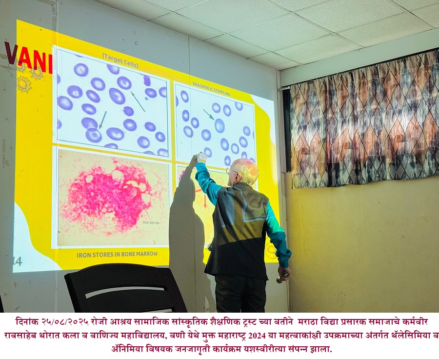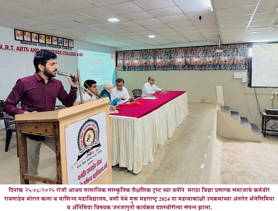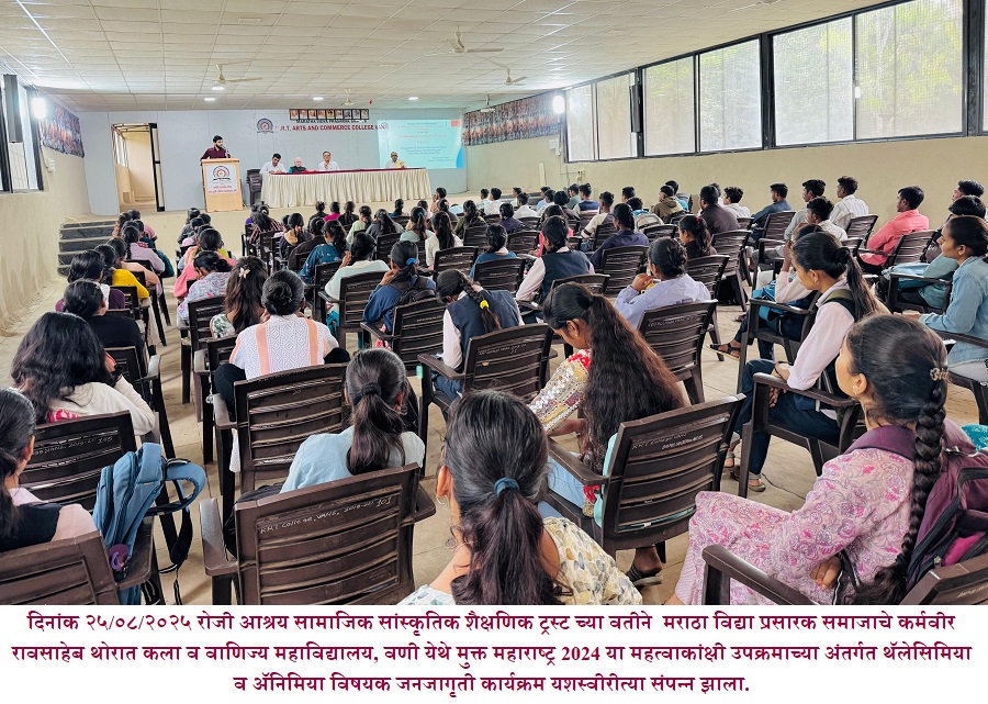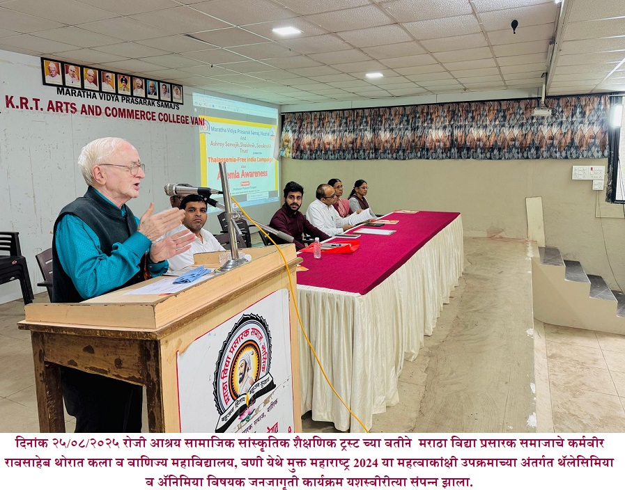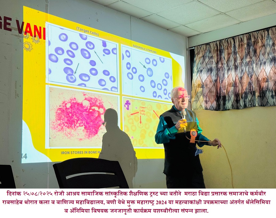 दिनांक ६ ऑगस्ट २०२५ रोजी थॅलेसेमिया जनजागृती कार्यक्रम वडनेर भैरव महाविद्यालयात संपन्न आश्रय ट्रस्ट मुंबई चे वतीने विद्यार्थ्यांना आरोग्यविषयक मार्गदर्शन; थॅलेसेमियावर सखोल चर्चा.