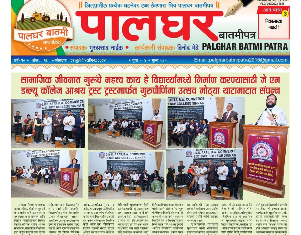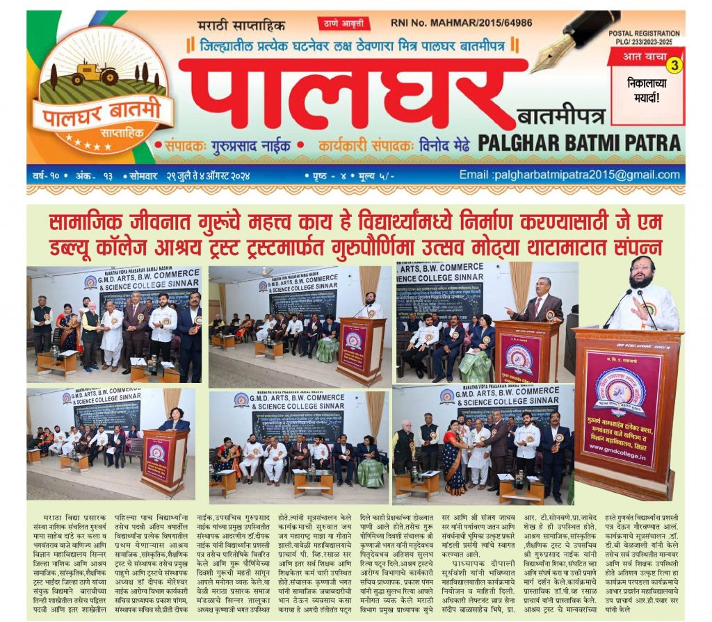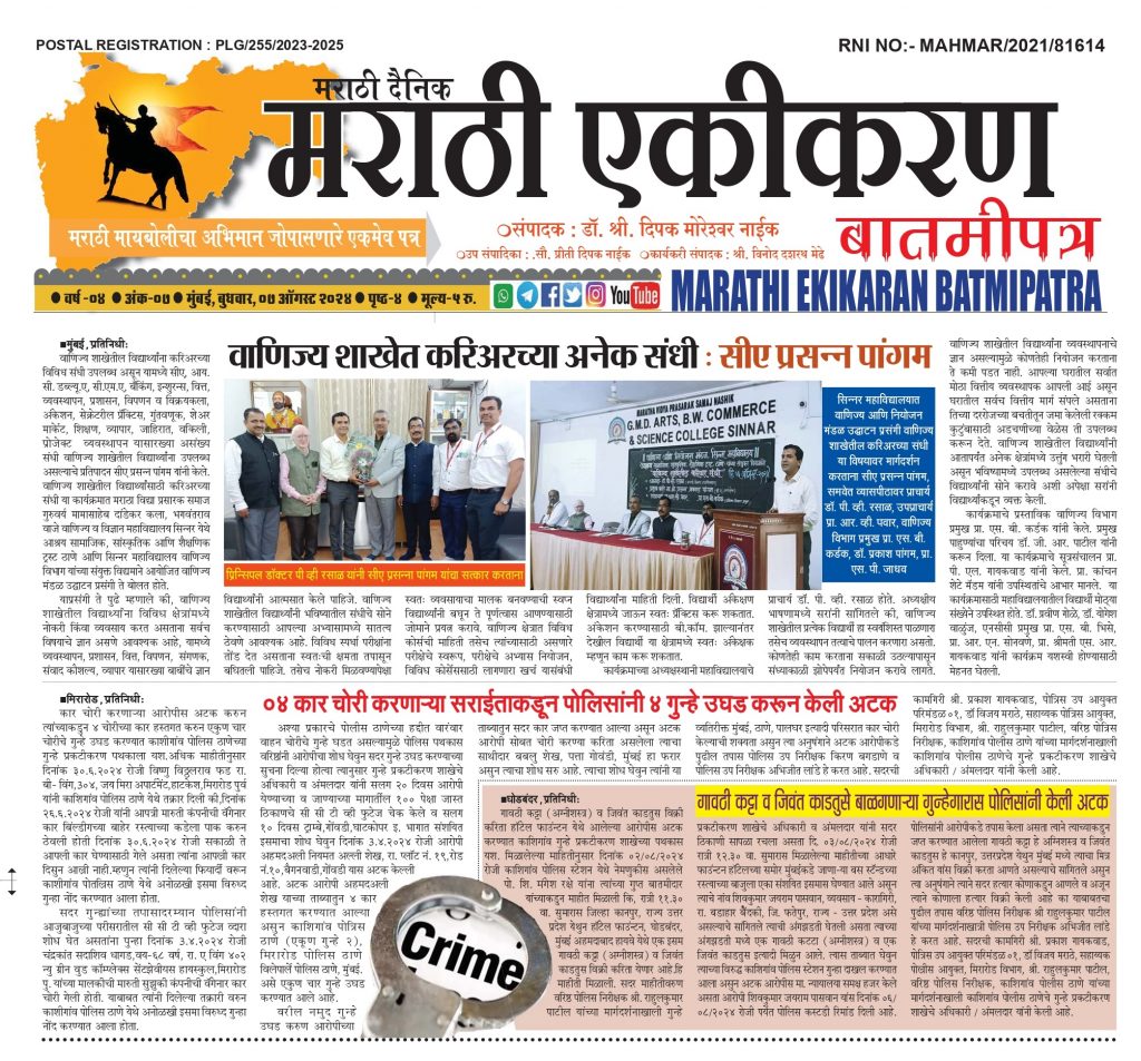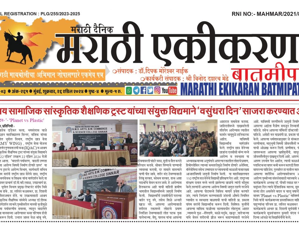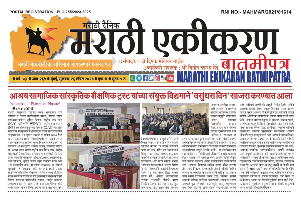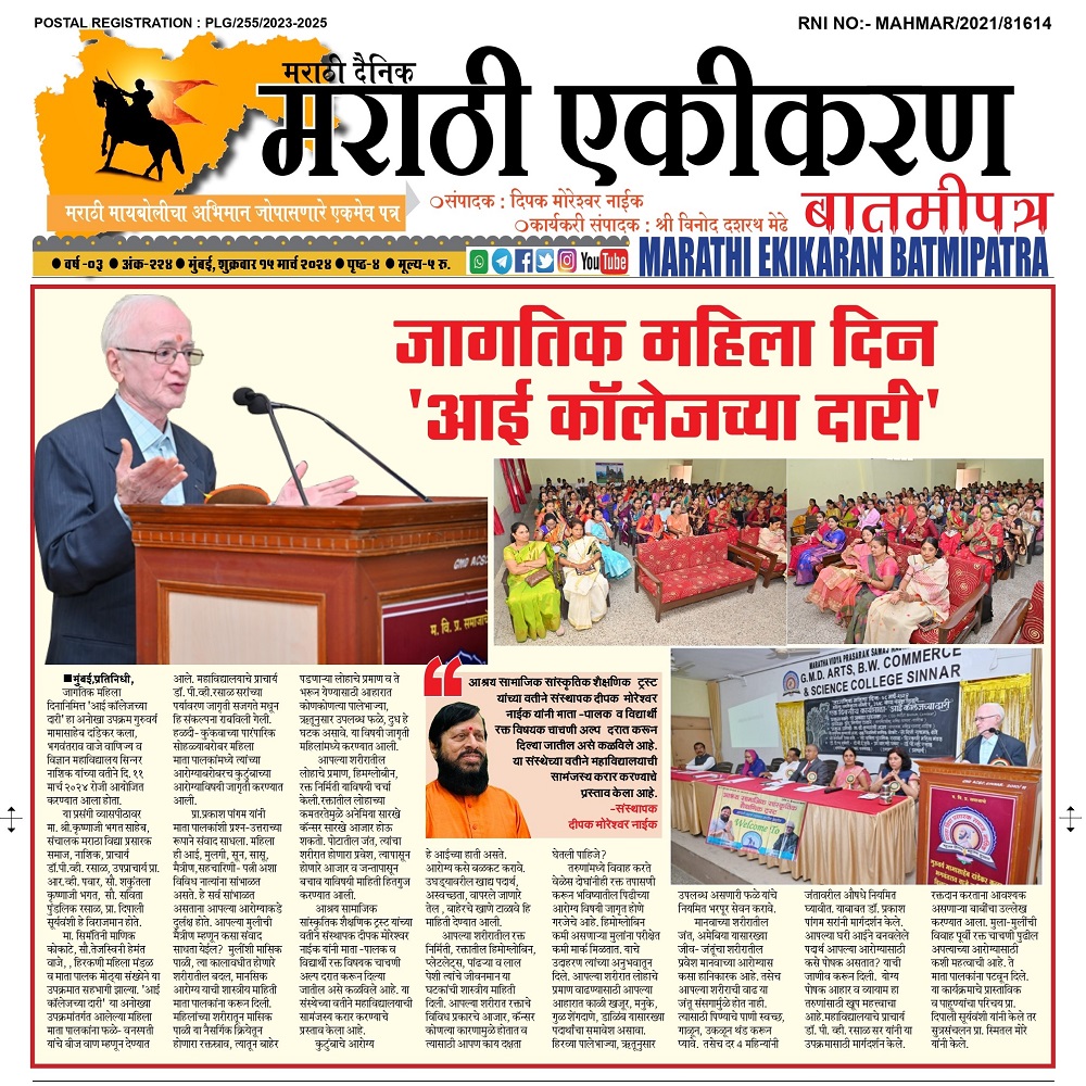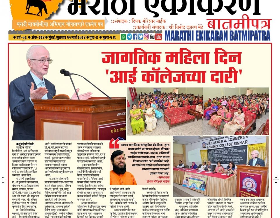 जागतिक महिला दिनानिमित्त ‘आई कॉलेजच्या दारी’ हा अनोखा उपक्रम गुरुवर्य मामासाहेब दांडेकर कला, भगवंतराव वाजे वाणिज्य व विज्ञान महाविद्यालय सिन्नर नाशिक यांच्या वतीने दि. ११ मार्च […]