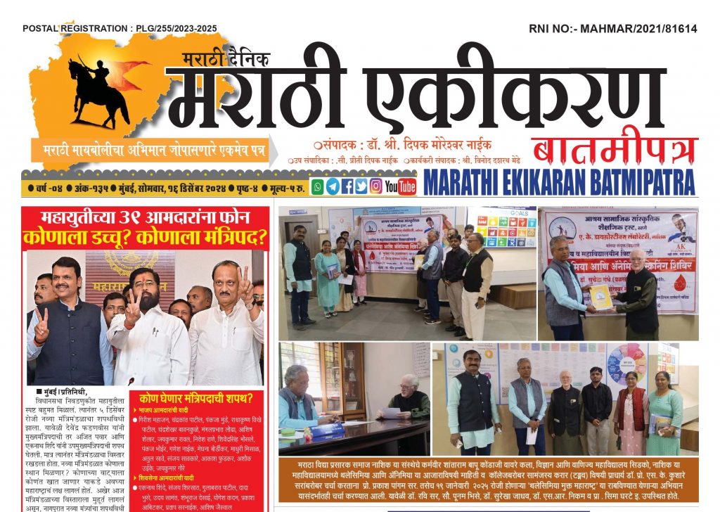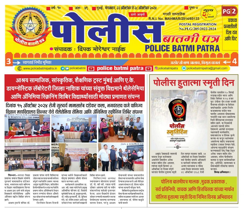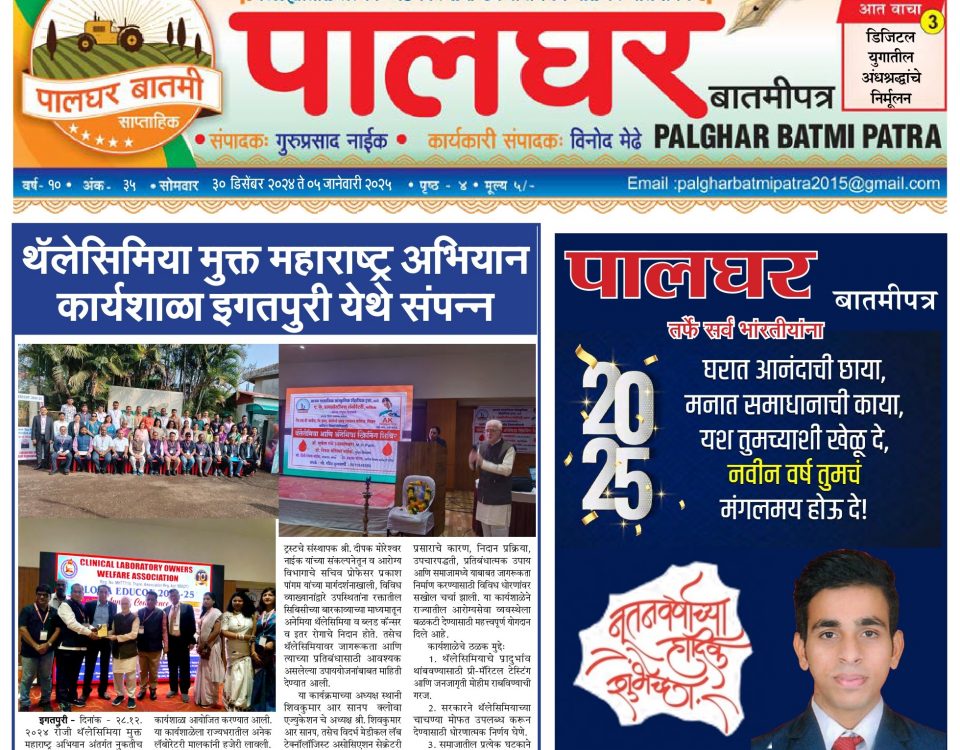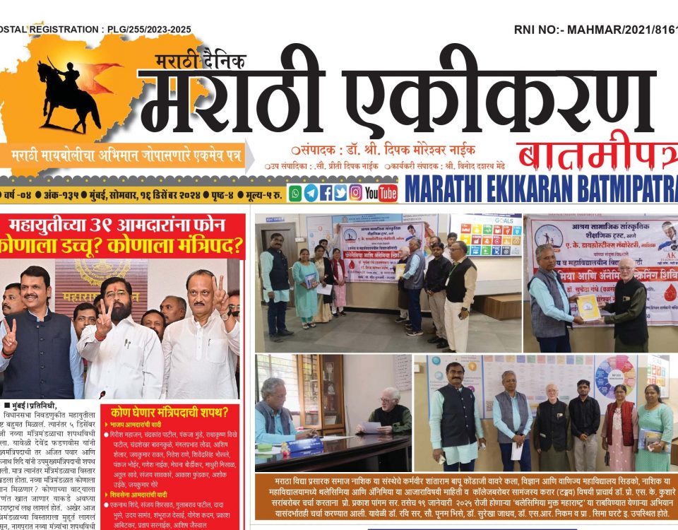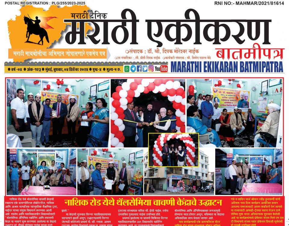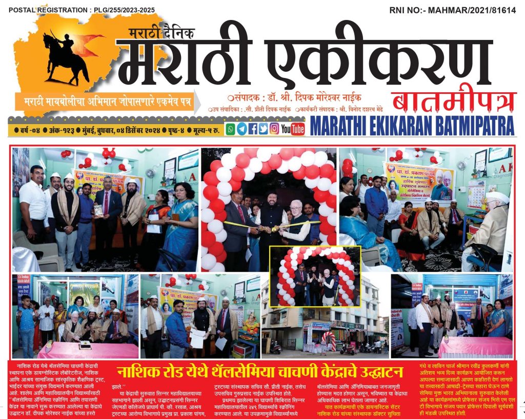 दिनांक ३०.११.२०२४ – नाशिक रोड येथे थॅलसेमिया चाचणी केंद्राची स्थापना एके डायग्नोस्टिक लॅबोरेटरीज, नाशिक आणि आश्रय सामाजिक सांस्कृतिक शैक्षणिक ट्रस्ट, भाईंदर यांच्या संयुक्त विद्यमाने करण्यात आली […]