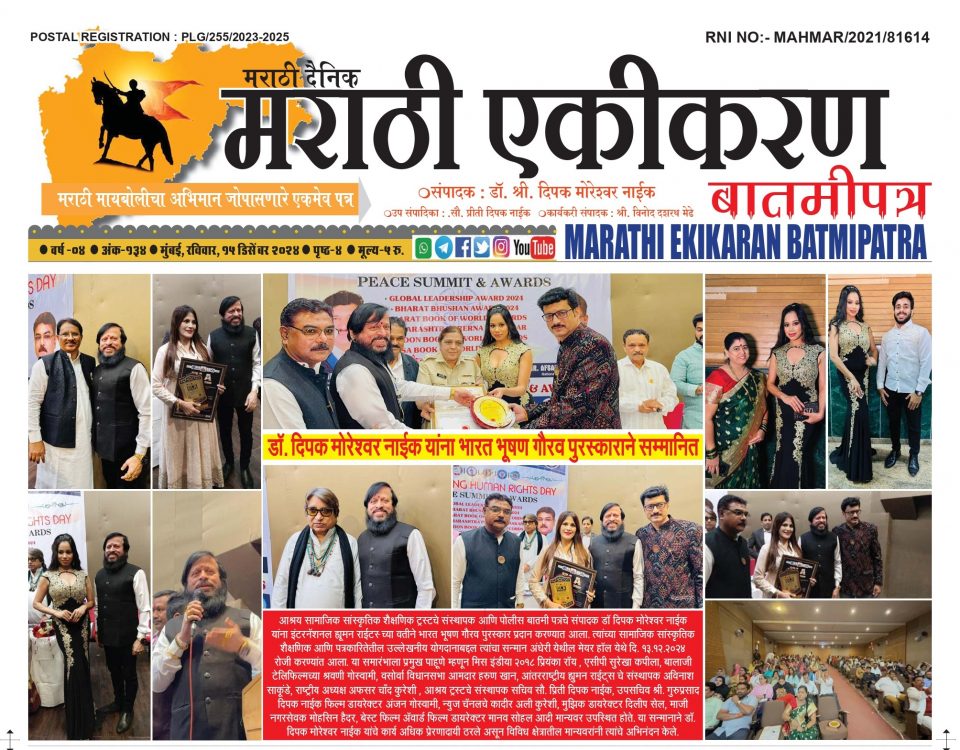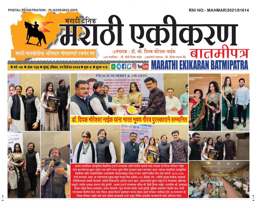 आश्रय सामाजिक सांस्कृतिक शैक्षणिक ट्रस्टचे संस्थापक आणि पोलीस बातमी पत्रचे संपादक डॉ दिपक मोरेश्वर नाईक यांना इंटरनॅशनल ह्यूमन राईटस् च्या वतीने भारत भूषण गौरव पुरस्कार प्रदान […]