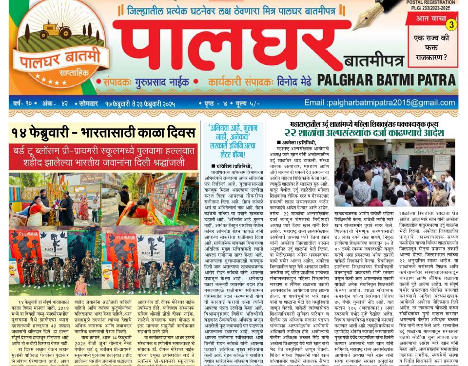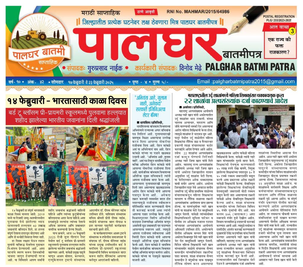 दिनांक १४ फेब्रुवारी २०२५ रोजी जुना गोल्डन नेस्ट येथील बर्ड टू ब्लॉसम प्री प्रायमरी स्कूल येथे पुलवामा येथे शहीद झालेल्या भारतीय जवानांना श्रद्धांजली अर्पण करण्यात आली […]